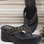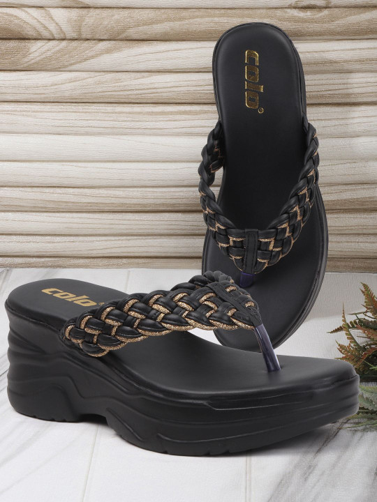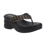 A pair of black sandals ,has regular ankle and open back Synthetic solid upper with other Cushioned footbed Textured and patterend outsole, has a wedge