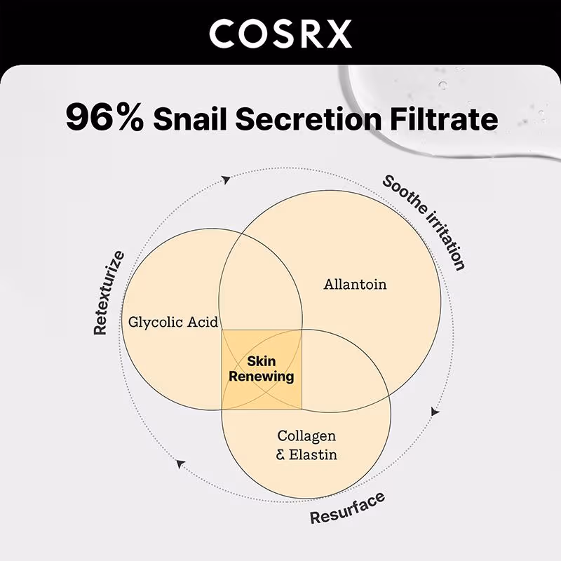 • Lightweight essence enriched with 96% snail mucin extract to hydrate skin and improve its texture