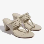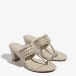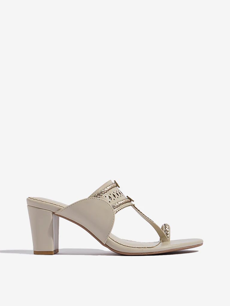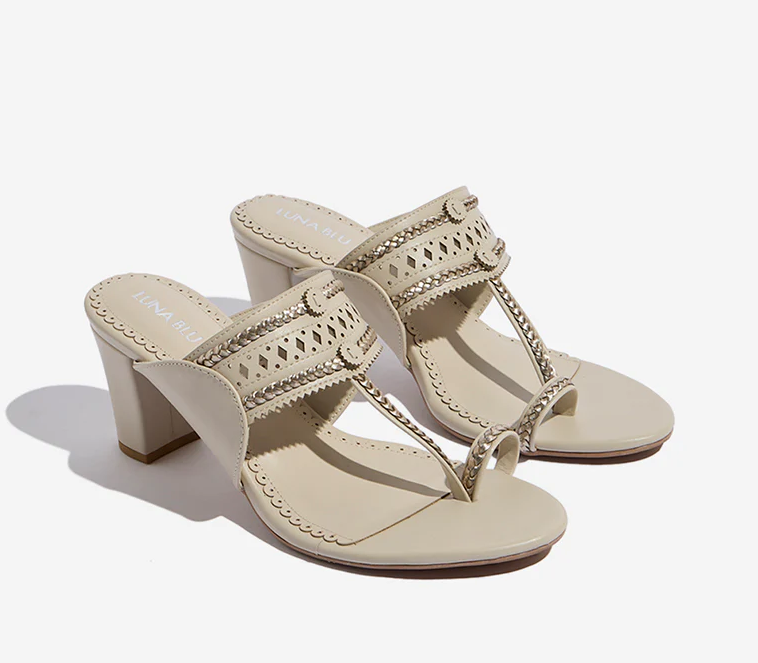 These ivory Kolhapuri heel sandals from Luna Blu showcase a broad braided strap and a toe ring, blending traditional charm with everyday comfort. Featuring a cushioned footbed for superior support and a sturdy block heel for added height and stability, they offer both style and ease with every step.